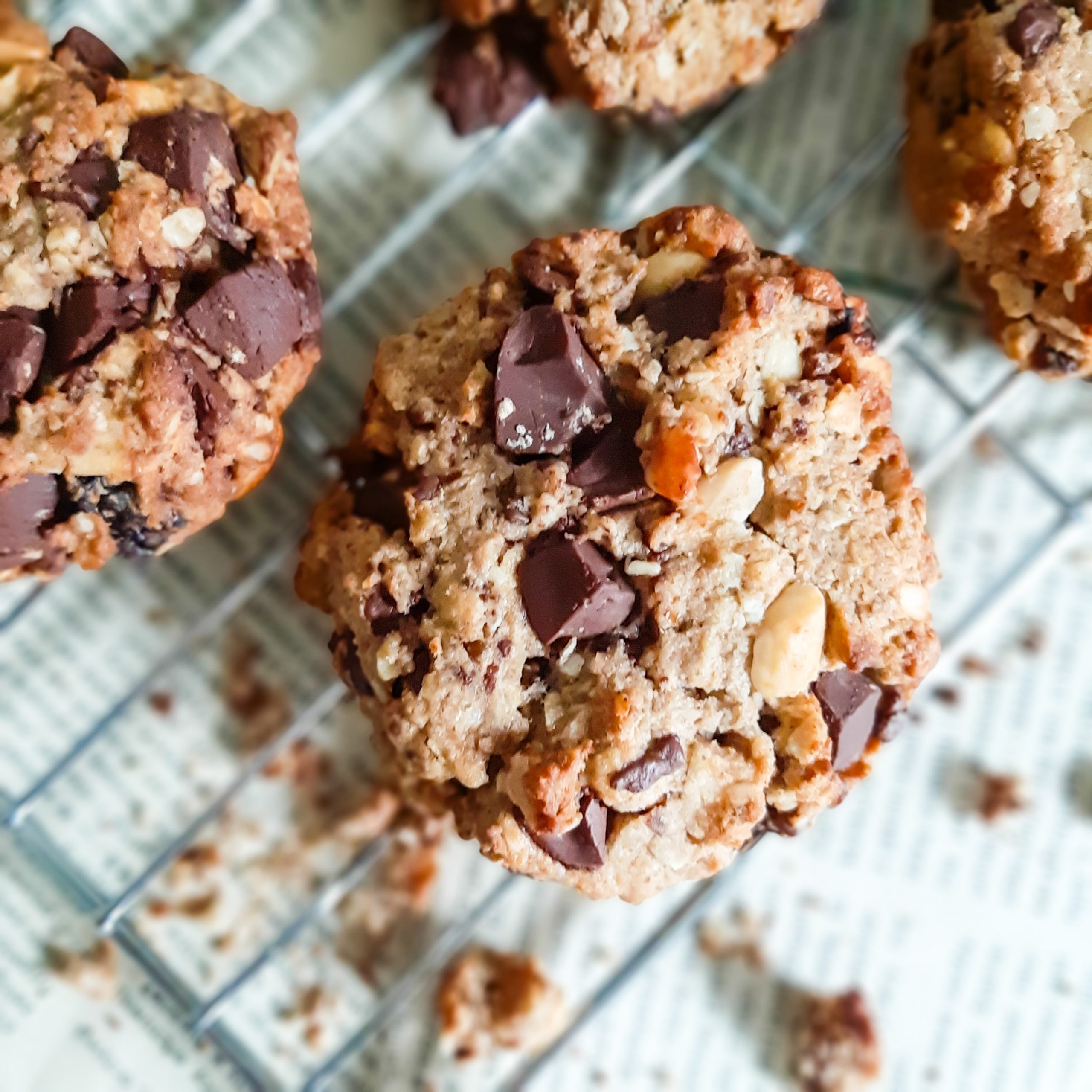Czekolady i bakalie pokroić w drobną kostkę. Całość składników dokładnie wymieszać. Ułożyć na blaszce formując ciastka. Piec ok. 12-15 min w temp. 180 stopni.